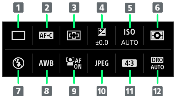 | ホワイトバランス | 「オート」「曇天」「太陽光」「蛍光灯」「電球」「日陰」「色温度1」「色温度2」「色温度3」「カスタム1」「カスタム2」「カスタム3」から選択します。 ・「色温度1」「色温度2」「色温度3」では、ホワイトバランスを手動で調整して3つまで登録できます。 手動で調整するには、//色温度を選択と操作し、以降は画面の指示に従って操作してください。 ・「カスタム1」「カスタム2」「カスタム3」を選択した状態で、取り込みを行うと、撮影環境に合わせたホワイトバランスを3つまで登録できます。基準となる白色を調整するには、//と操作し、以降は画面の指示に従って操作してください。 ・各プリセットのホワイトバランスを手動で調整する場合は、項目を選択してオレンジ色の点( |