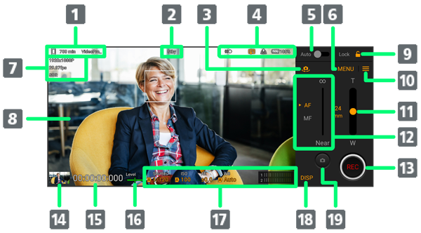 | Lockボタン | タップすると画面右側の項目と下側の項目エリアがロックされ、本機を構えたときに誤って設定が変更されないようにすることができます。 |