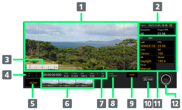 | オーディオレベルメーター | 音声レベルを確認できます。 タップするとCinema Proのメニューの「Audio settings」が表示されます。 |