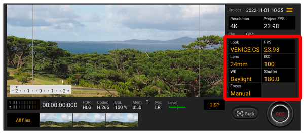 Cinema Pro画面で、設定項目をタップ