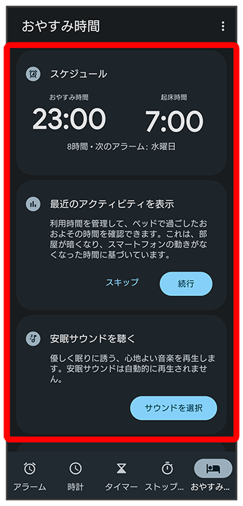 毎日の起床時間と就寝時間を設定して睡眠スケジュールを管理したり、快適な睡眠をサポートする機能を設定したりできます。