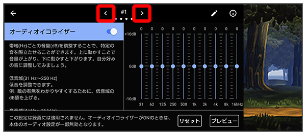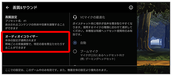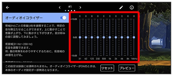オーディオイコライザーの設定を4つまでプリセットできます。ゲームの状況に応じてプリセットを選択して、音を調整することができます。
