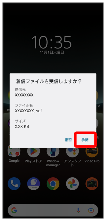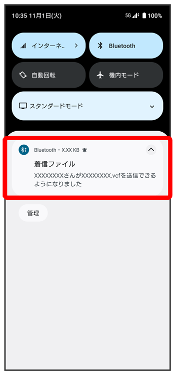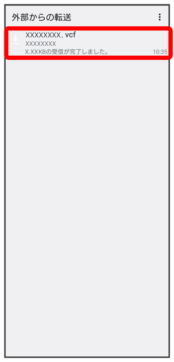 ステータスバーを下にフリック着信ファイルの通知をタップ