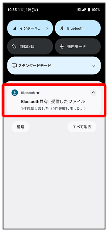 受信完了後、ステータスバーを下にフリックファイル受信の通知をタップ