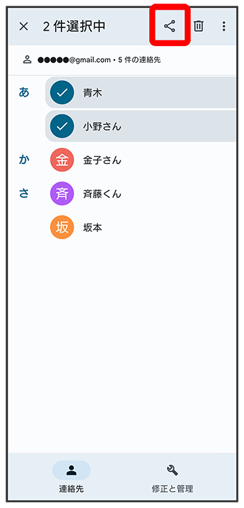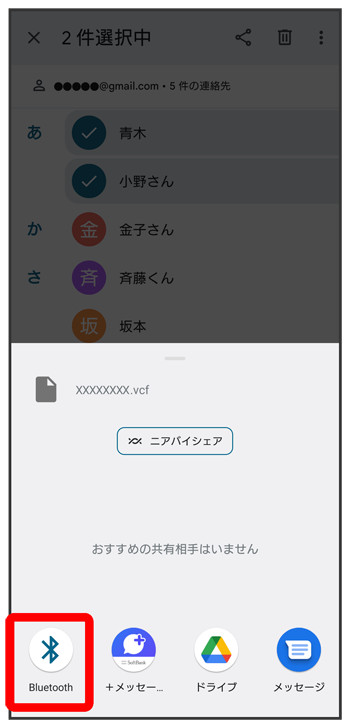 - 複数の連絡先を送信する場合は、対象の連絡先をロングタッチ(