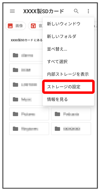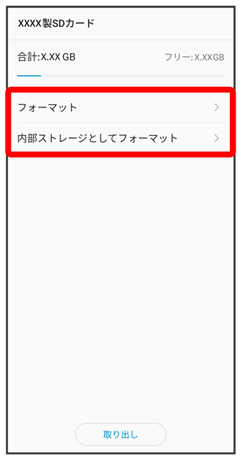 - SDカードを内部ストレージとして使用する場合は、外部ストレージとして使用する場合はをタップします。