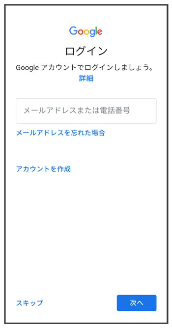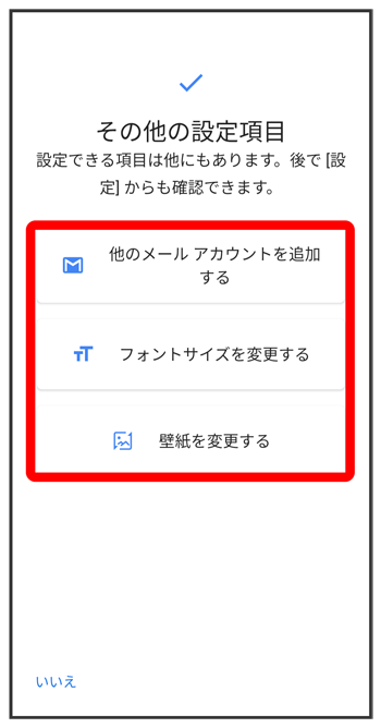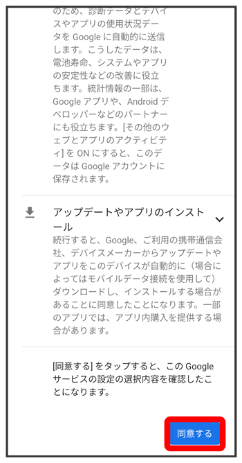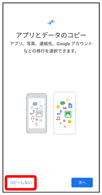 - をタップすると、Google アカウントを設定しているほかの端末からデータをコピーできます。画面の指示に従って操作してください。