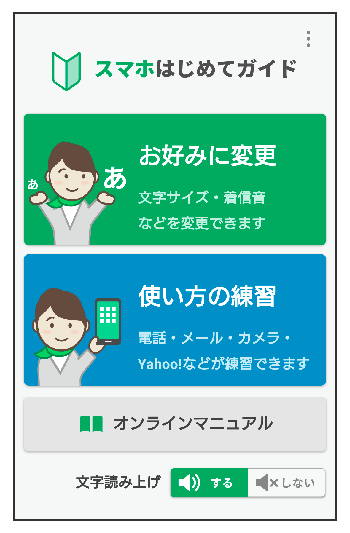 スマホはじめてガイドは、スマホでよく使う機能の練習や、基本的な設定をかんたんに行うことができます。