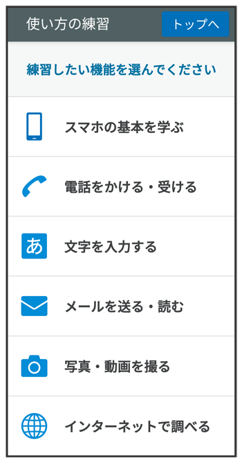 「使い方の練習」では、スマホでよく使う基本的な機能を、実際の画面で練習することができます。