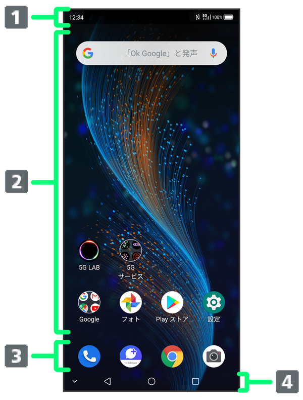 | カスタマイズエリア | アプリのショートカットやフォルダ、ウィジェットを自由に配置できます。 |