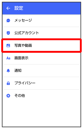 | 受信した写真や動画を端末に自動保存 | 受信した写真や動画などのファイルを、端末に自動保存するかどうかを設定します。 |