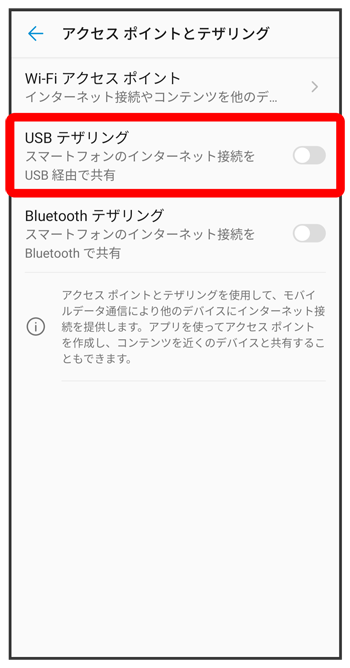 - 本機上に「USBの使用」画面が表示されたら、をタップします。