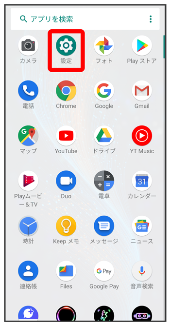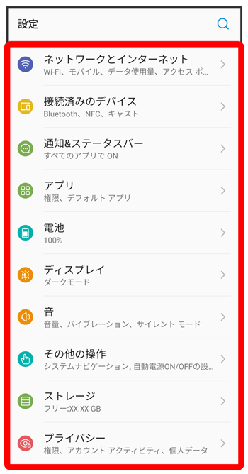 | ネットワークとインターネット | Wi-Fiやモバイルネットワーク、データ使用量など、ネットワークやインターネットに関する設定ができます。 |