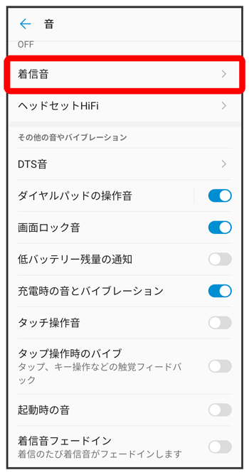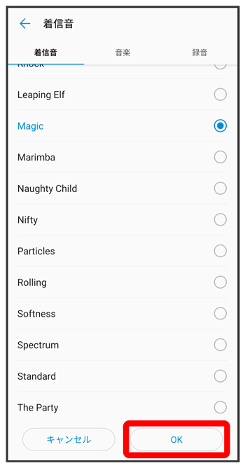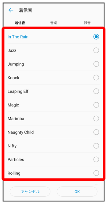 - タブをタップすると、音楽ファイルを着信音に設定できます。タブをタップすると、SDカードまたは内部ストレージの「Records」フォルダに保存した音声を設定できます。