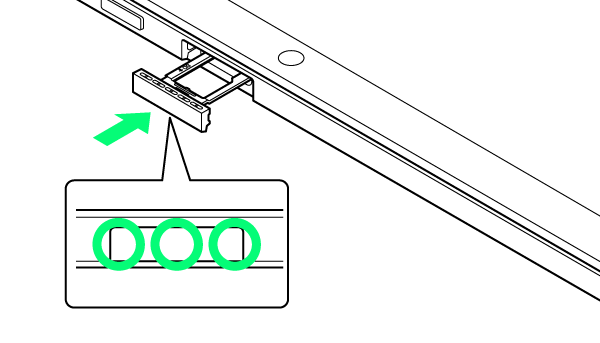 - ○の位置をしっかりと押し、USIM/SDカードトレイが本体から飛び出していないことを確認してください。