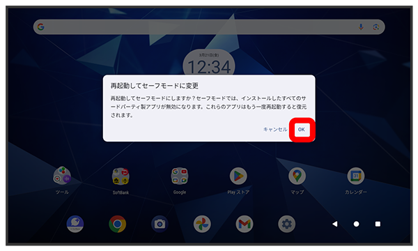 - セーフモードで電源を入れると、画面左下に「セーフモード」と表示されます。