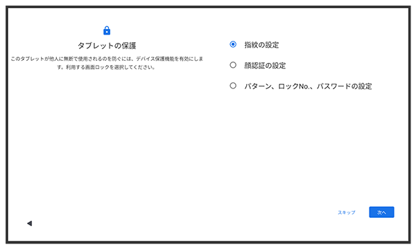 - スタート画面のセキュリティを設定しないときは、をタップします。