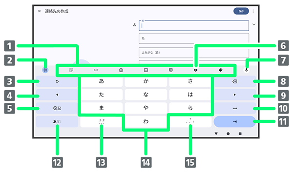 - 文字入力モードを切り替えます(ひらがな/英字/数字)。2