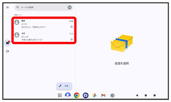 メール一覧画面で未読にするメールをロングタッチメールを削除する