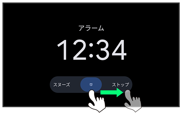 をへドラッグするとスヌーズが設定されます。- スリープ中でないとき、またはスタート画面を表示していないときは、ポップアップでアラーム通知画面が表示されます。アラームを止めるときは、スヌーズを利用する場合はをタップします。