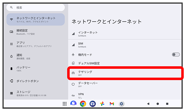 テザリング画面が表示されます。