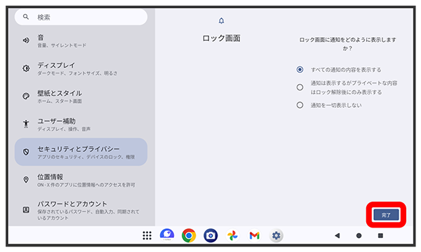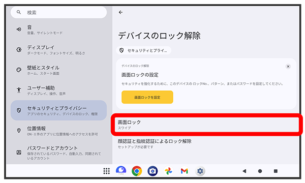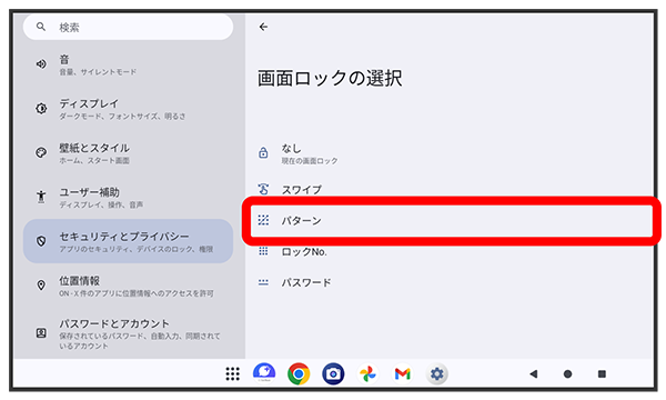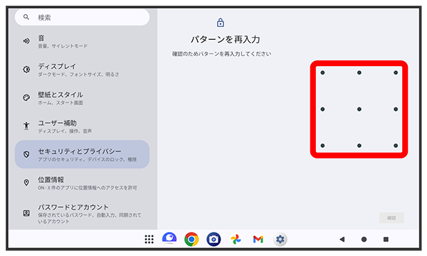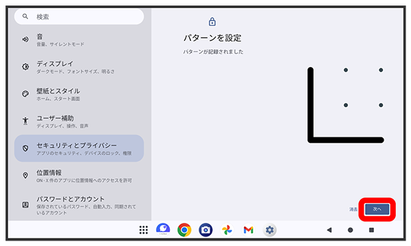 パターンを指でなぞってスタート画面のセキュリティを解除するように設定する