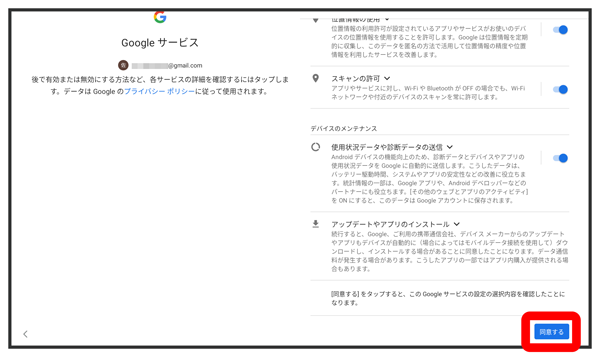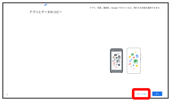 - をタップすると、Google アカウントを設定しているほかの端末からデータをコピーできます。画面の指示に従って操作してください。