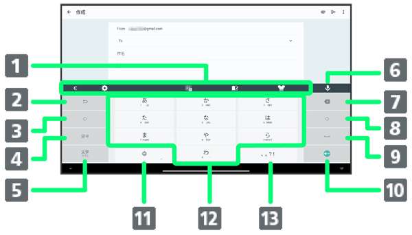 - ソフトウェアキーボードをGboardに切り替えます。ロングタッチすると、切り替えるソフトウェアキーボードを選択できます。入力中の文字に対し、「゛」(濁点)/「゜」(半濁点)の入力、および大文字/小文字への変換を行います。