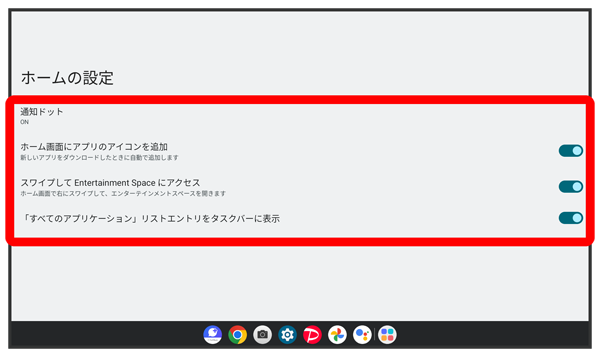 | スワイプして Entertainment Space にアクセス | ホーム画面を右にスワイプしたときに、エンターテイメントスペースを開くかどうかを設定します。 |