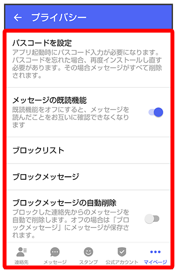 | ブロックメッセージの自動削除 | ブロックした連絡先からのメッセージを自動で削除するかどうかを設定します。 |