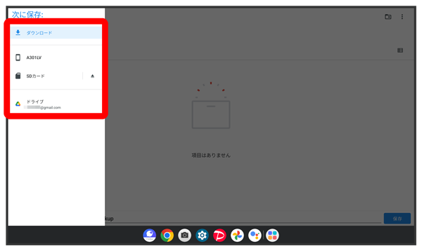- SDカードはSDカードを挿入している場合、Google ドライブはGoogle アカウントを設定している場合に表示されます。