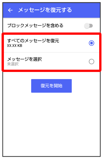 - ブロックしたメッセージを含めて復元する場合はを有効(