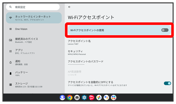 アクセスポイントとテザリング画面で「アクセスポイント名」、「セキュリティ」、「アクセスポイントのパスワード」などを画面の指示に従って設定