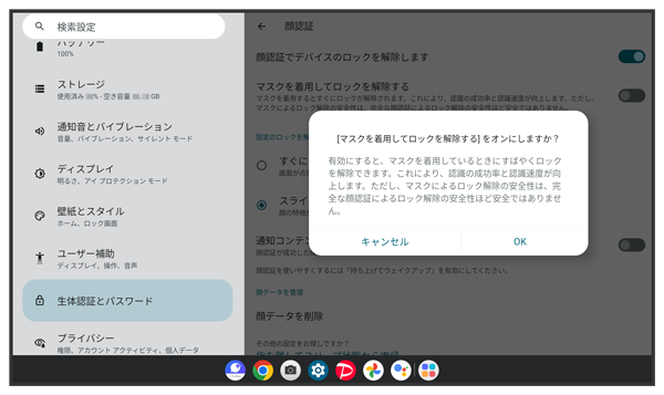 マスクを着用した状態でも顔認証でデバイスのロックを解除するかどうかを設定する