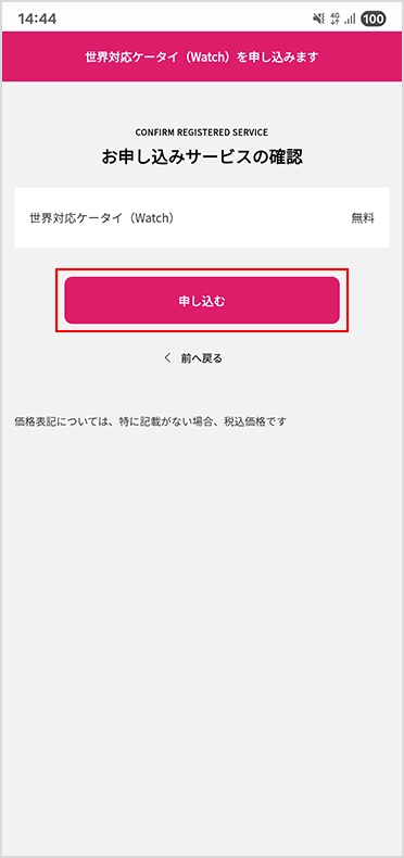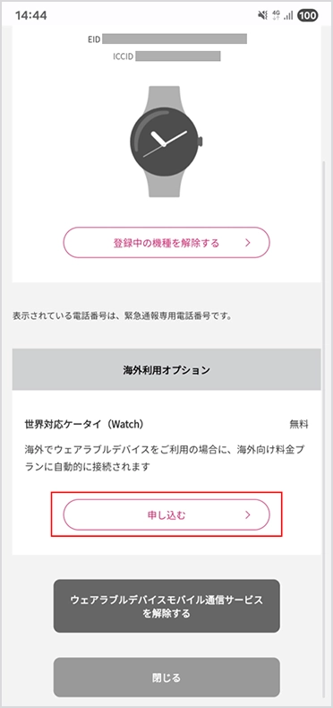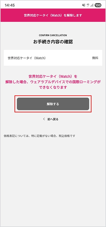 「ウェアラブルデバイスモバイル通信サービスを解約する」を選択