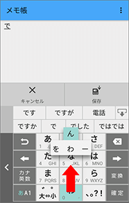 | フリック入力 | キーの上で、上下左右に指をはらって文字を入力する方法です。 |