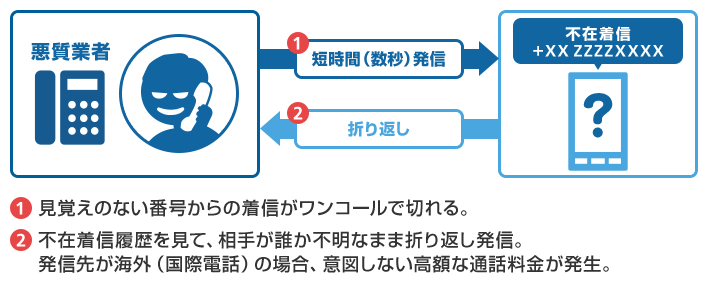 心当たりのない着信履歴の電話番号へ折り返し電話をする場合は、くれぐれもご注意ください。場合よっては、国際電話となり、通話料金が高額となる場合があります。必ず発信先をお確かめください。