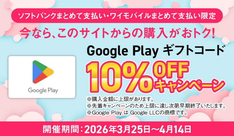 Google Play ギフトコードを、まとめて支払いでご購入いただくと、購入金額の10%が割引されます