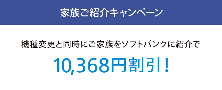 当社指定機種へ機種変更したお客さまのご紹介で、ご家族がソフトバンクにのりかえると、ご紹介者さまの毎月のご利用料金から10,368円割引します。