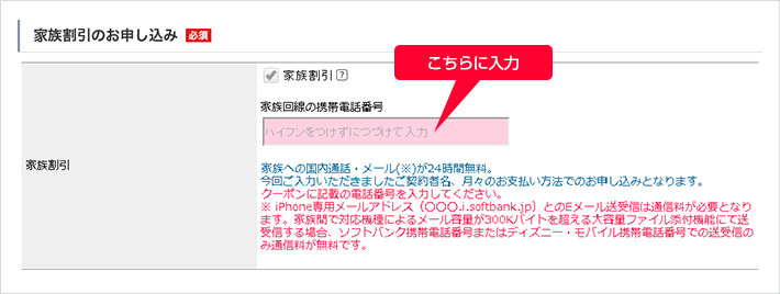 - オンラインショップでお申し込みの場合、お申し込み情報入力②画面の家族割引欄に紹介者の携帯電話番号を必ずご入力ください。