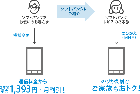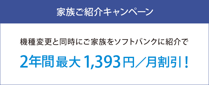 当社指定機種へ機種変更したお客さまのご紹介で、ご家族がソフトバンクにのりかえると、ご紹介者さまの毎月のご利用料金を割引するキャンペーンです。