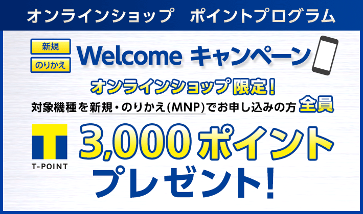 ソフトバンクオンラインショップで対象機種を新規・のりかえ(MNP)でお申し込みいただいた方に、もれなくTポイントをプレゼントします。