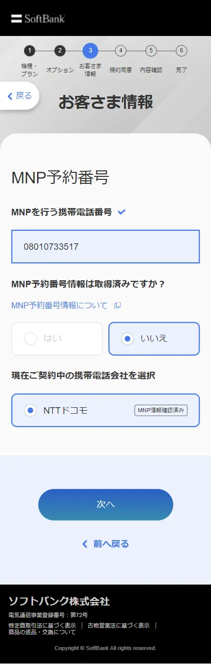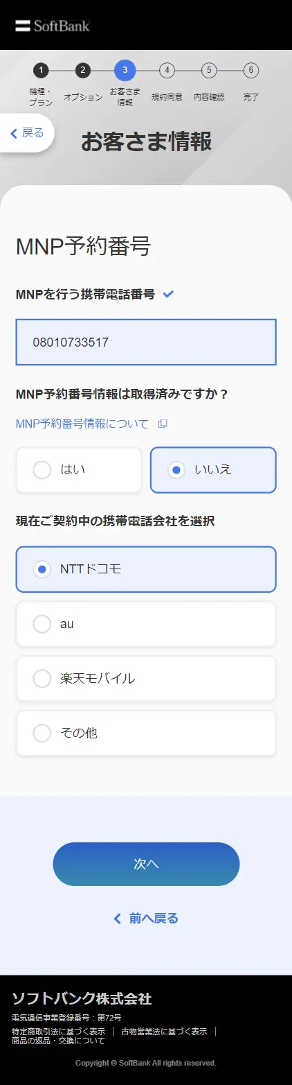 電話番号を入力後、「MNP予約番号情報は取得済みですか?」で「いいえ」を選択し、現在ご契約中の携帯電話会社を選択して、「次へ」をタップ。