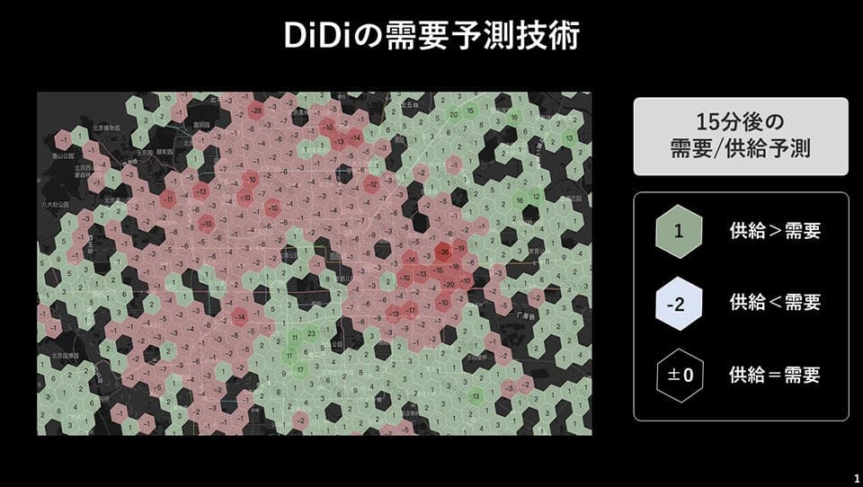「DiDi」というプロダクトが生み出している価値は、乗客とドライバーの最適なマッチングです。早く目的地に着きたい乗客と、乗客を早く見つけたいドライバー。この双方を高速でマッチングするために、5,000人のエンジニアが磨き上げたAI技術を活用しています。一つの例として、すでに中国では実装されている、機械学習を用いた「AIヒートマップ」という機能の実装を日本でも予定しています。地図上にタクシーの需要と供給のバランスがリアルタイムに表示され、その情報をドライバーのタブレット端末に配信。「心斎橋に乗客が多い」「梅田には少ない」といった需給状況が常に把握できるようになるので、ドライバーは効率的に乗客を探すことができます。また、「天気や気温によってタクシー需要がどのように変化するのか」「曜日や時間帯によってどのエリアの需要が増えるのか」など、膨大なデータを分析して予測モデルを日本でも構築することができるようになります。5億5,000万のユーザーの行動履歴をもとにアップデートを重ねている、バックエンドの機械学習の技術は、世界トップレベルだと自負しています。
