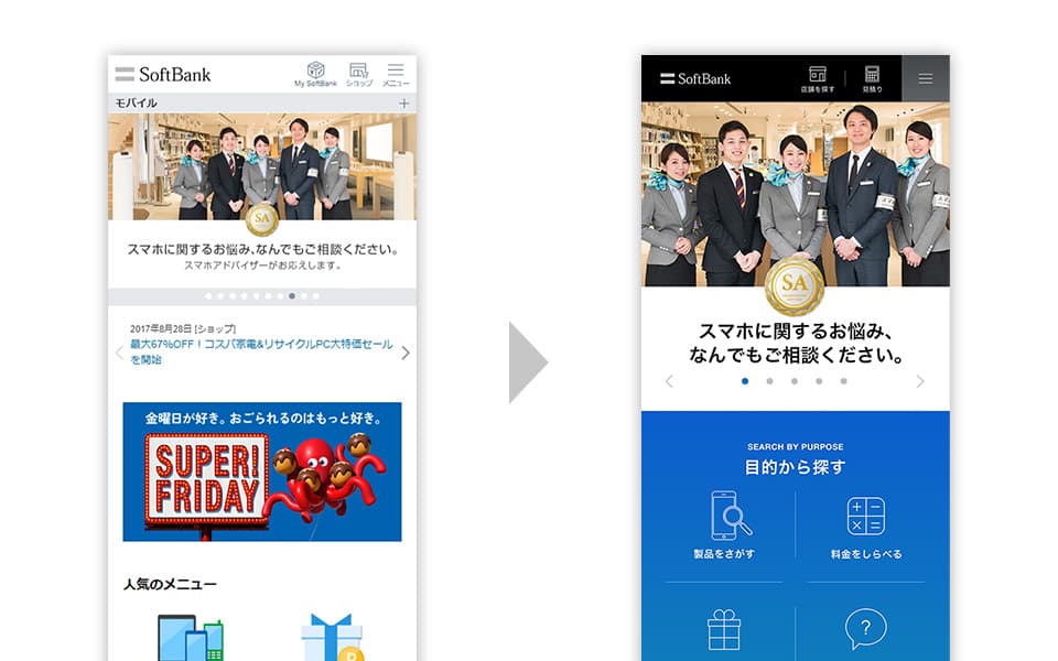 携帯会社の公式サイトに一般ユーザーは普段気軽にアクセスしませんよね。年に数回、買い替え検討や何か困りごとがある時に見るのが一般的ではないでしょうか。それであれば、広告バナーを見せるよりも、ユーザー体験を優先して、すぐに困りごとを解決できる導線設計にした方が良いのは当たり前です。だから、「ファーストビューは目標達成を第一にするべき」と考えました。