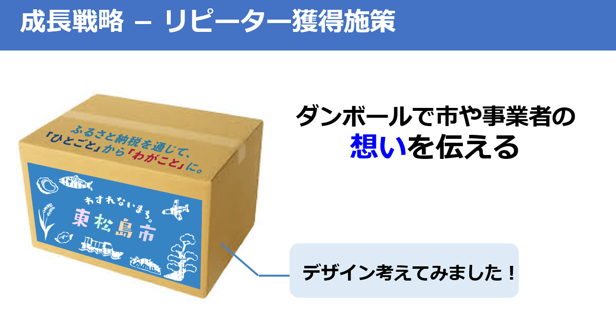 また、リピーター獲得施策として、返礼品を届ける段ボールに事業者が地域にかける熱い思いを記して、東松島市を想起させるデザインに刷新することを提案。