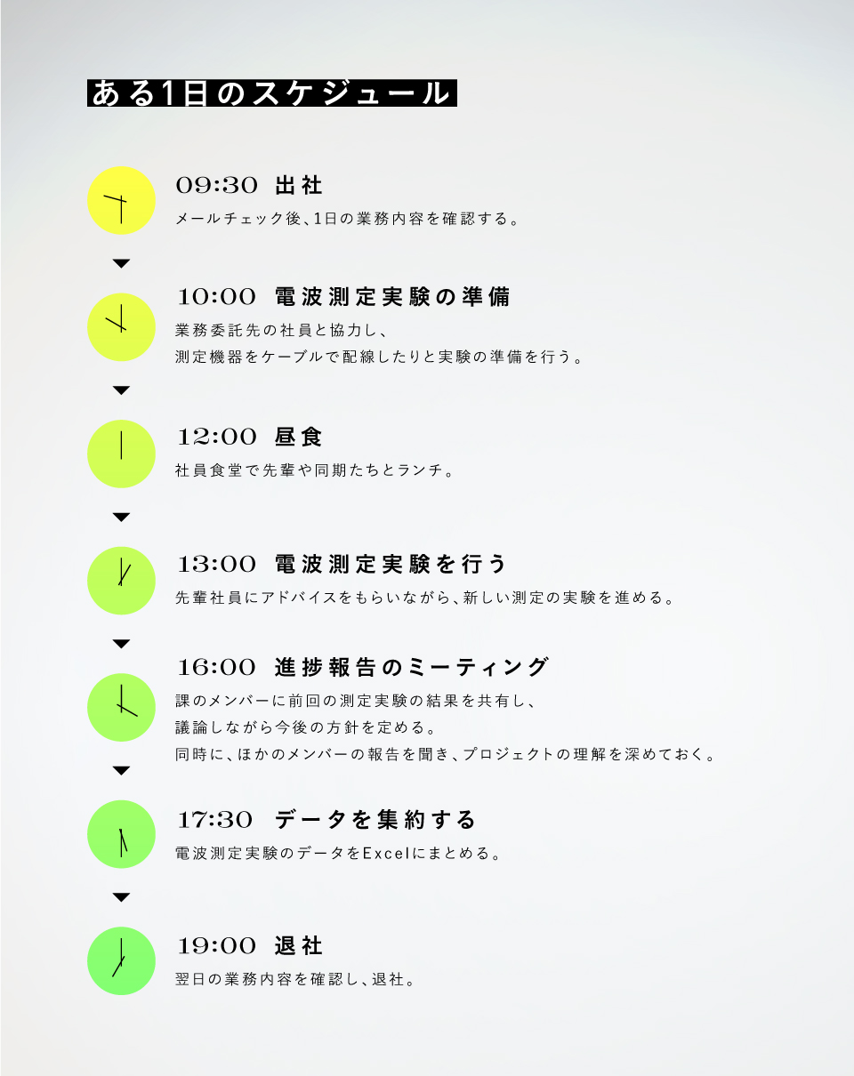 - 私は通勤に時間がかかるということもあって、出社は週2ペース。在宅ワークの日は集中して作業して、出社日は先輩や同期と積極的にコミュニケーションを取るようにしています。残業は繁忙期以外は今のところ少なめですね。研究者のスケジュールが気になるけど、2人はどんな1日を過ごしているの?