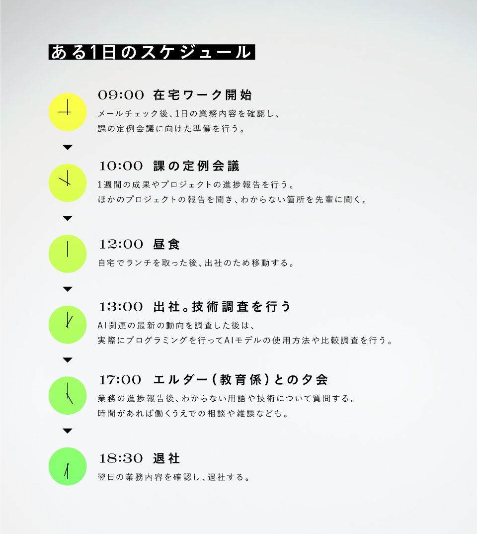 - 田舎出身なので朝の通勤ラッシュが苦手で。それを避けるため、午前中は在宅でリモートワーク、午後は出社が基本かな。残業はあったりなかったりですね。池田さんはどう?