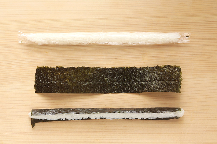 残りの酢めし(白)を棒状にし、「2」で残った海苔を巻き楕円形に整えます。