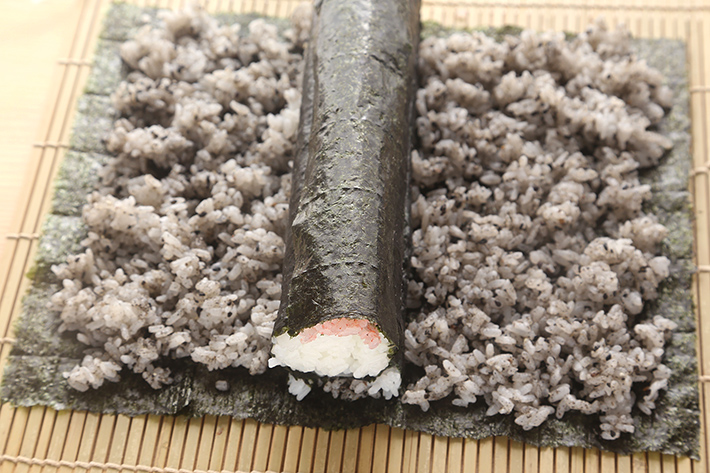 巻きすの上で海苔1枚と3分の1を1cmほど重ねてつなげます。つなげた所はご飯2~3粒で付けると剥がれにくくなりますよ。その上に「4」の耳を下にして中央に置きます。両脇を端から1cm残して残ったすりゴマ入りの酢飯を均等に広げましょう。